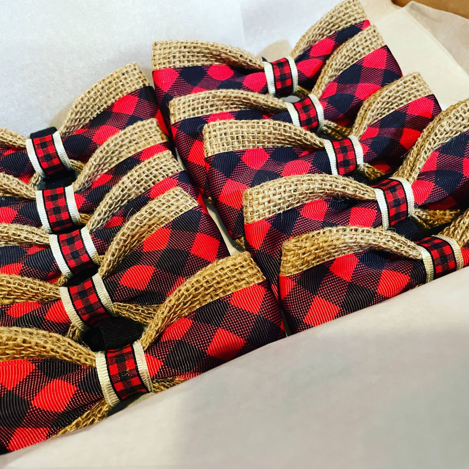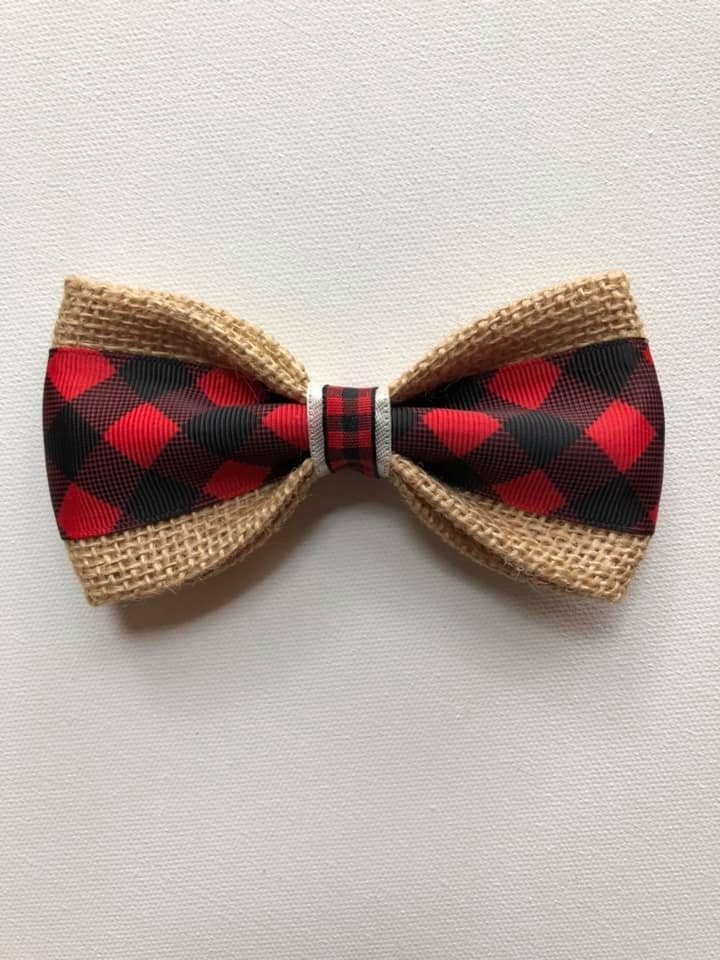 Buffalo plaid is one of our best sellers year round. This hugely popular black and red checkered print looks great on all dogs! Each burlap bow tie measures 5" and has an adjustable black velcro strap on the back to easily fit around collars and harnesses. *This is a bow tie design that we try to keep in stock. ALL BOW TIES SHIP IN A CLEAR PLASTIC ENVELOPE.