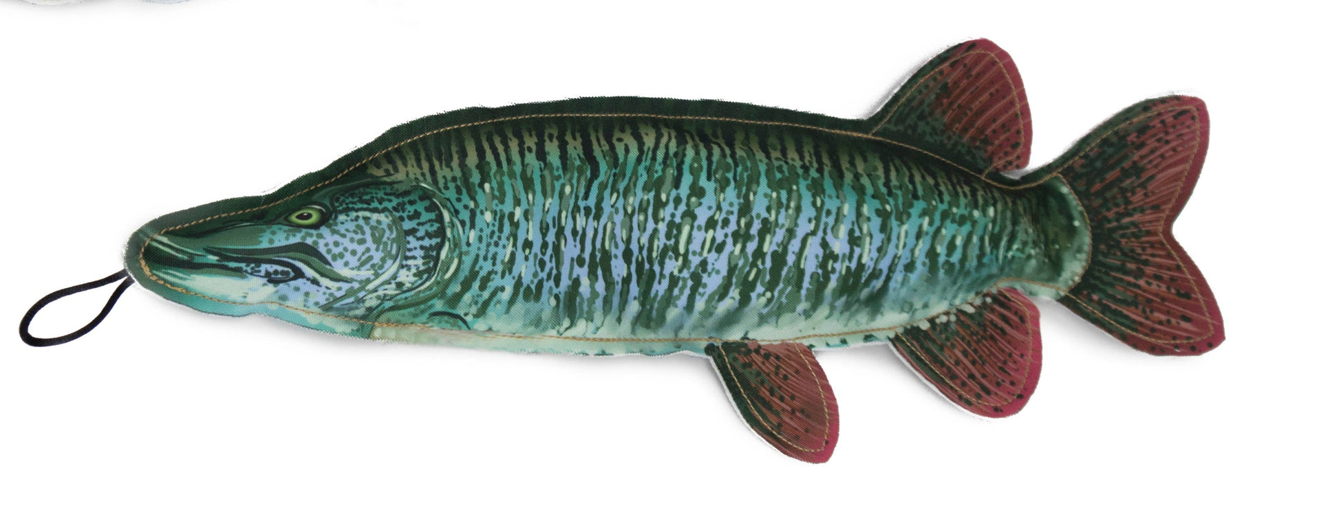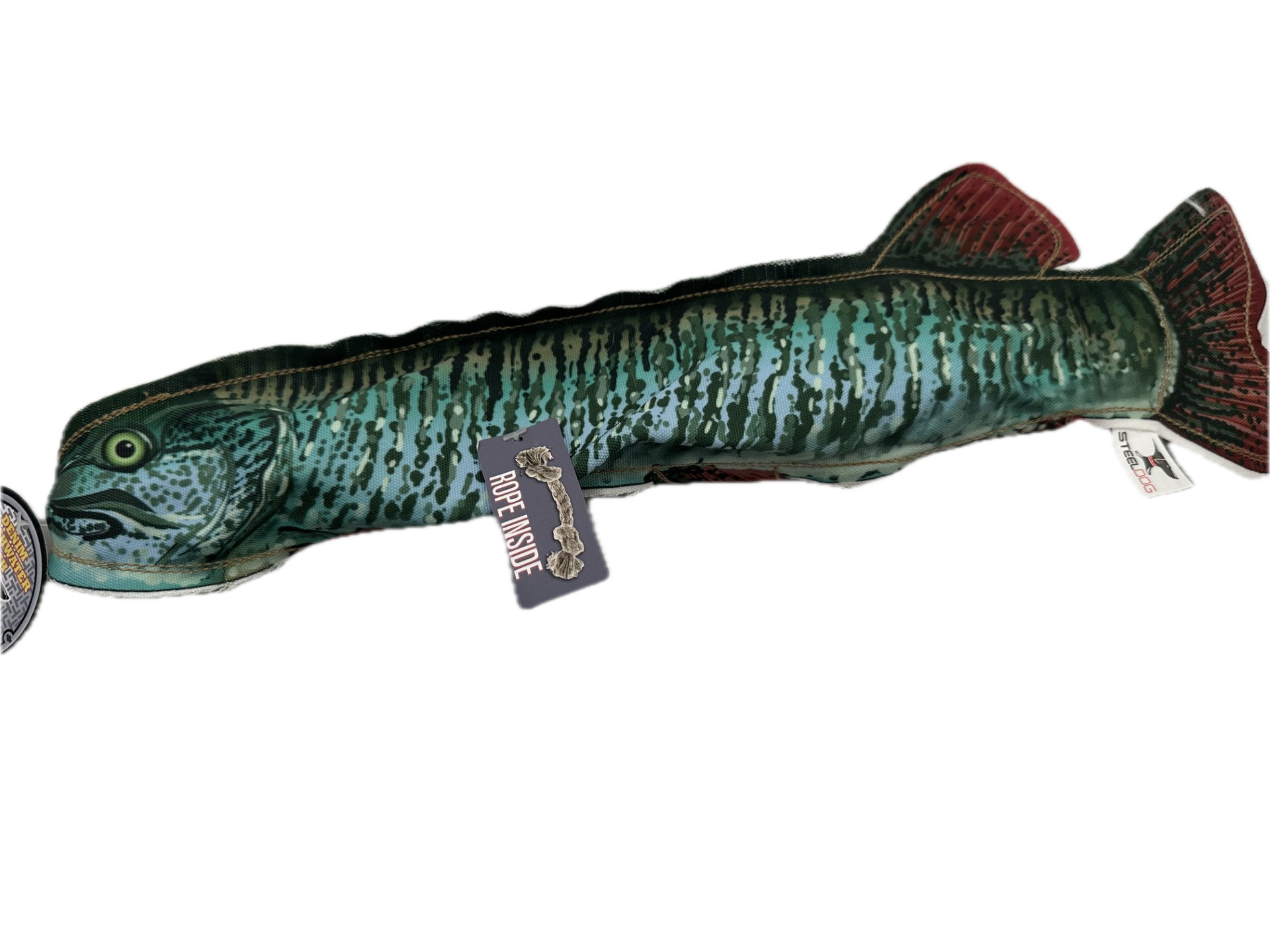 With a realistic print and durable body with rope inside, this Denim Muskie will be your dog’s second favorite fishing buddy. Inside includes a squeaker, but no stuffing for less of a mess. Denim Fish have a Tough Chew-o-Meter rating. Even if they do make it through the seams, another toy is ready to play!