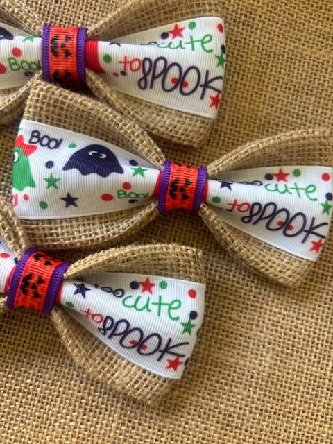 This is our standard size burlap dog bow tie. It measures 5" and has adjustable velcro on the back to easily fit around collars and harnesses. (All bow ties ship in a clear plastic envelope)